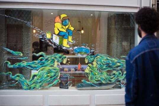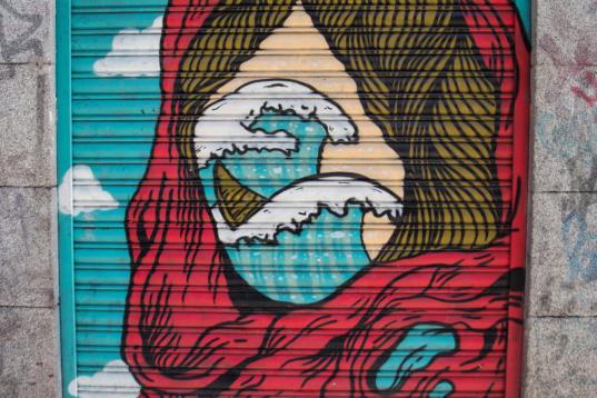Su representación hecha por el mexicano Jair Leal en la librería Arrebato Libros ha sido una de las más fotografiadas de este año y también forma parte de nuestra selección de obras de la edición 2018. Aquí no hay que invitar a nadie a entrar, el arte sale a la calle para que todo el mundo pueda verlo.