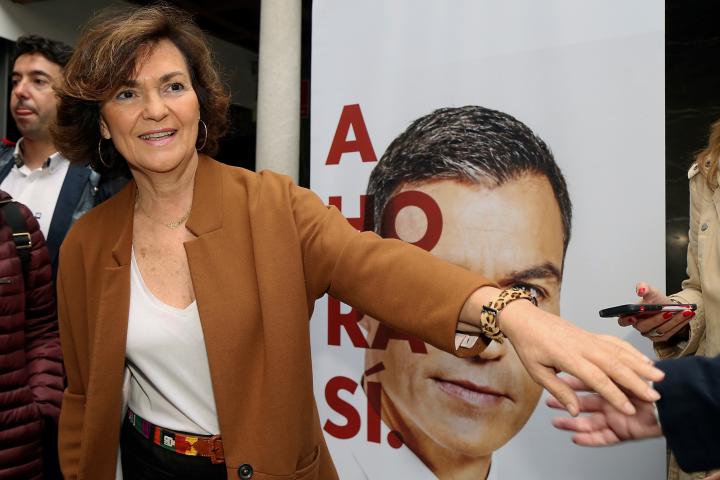La vicepresidenta del Gobierno en funciones, Carmen Calvo, coincide con el jefe del Ejecutivo, Pedro Sánchez, en que el Fiscal General del Estado es nombrado por el Gobierno, pero ha negado de forma tajante injerencias políticas en las decisiones judiciales.
