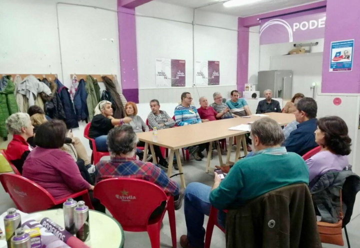 El tiempo se echa encima en el local con el cierre morado de la calle de Villacampa, la sede de Unidas Podemos en Vallecas. Veinticinco personas se sientan alrededor de una mesa. Llegan a trompicones. “Según van saliendo del curro”, cuenta Maby Cabrera, secretaria de organización. Una vez juntos tienen mucho que decidir: quién se pone en qué calle y cuándo a convencer a sus vecinos de que la papeleta morada es la mejor opción el 10-N.