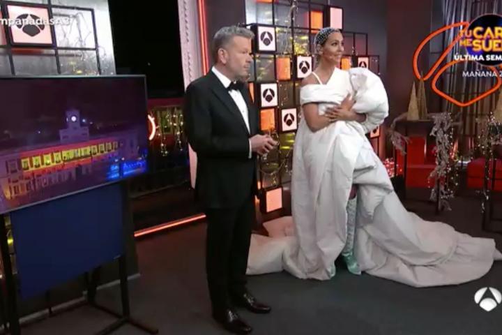 Sin embargo, la gran cantidad de patrocinios que tenían que cubrir ambos presentadores hizo que, cuando comenzaron a sonar los cuartos del reloj de la Puerta del Sol, este año vacía por la pandemia de coronavirus, Pedroche todavía llevaba una especie de edredón cubriéndola.