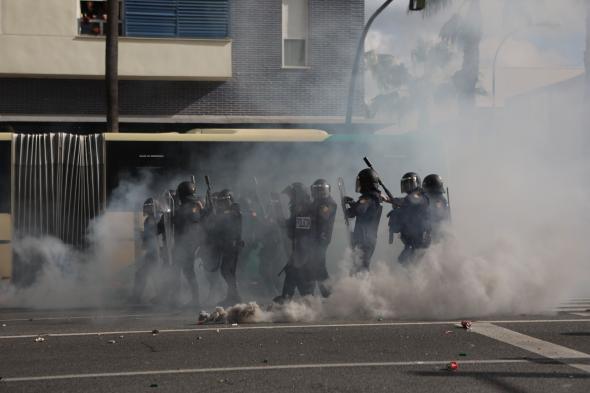 Los agentes de la UIP han respondido al lanzamiento de objetos y cortes de la vía con contenedores volcados con cargas y salvas de pelotas de goma. Los periodistas de TVE han confirmado la dureza de la intervención sobre el terreno, pero de momento se desconoce si hay heridos o detenidos.
