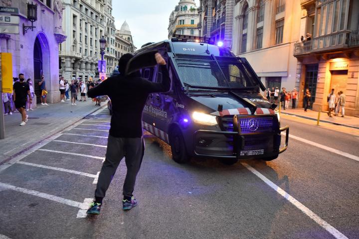 Agentes antidisturbios de los Mossos d’Esquadra, a pie y en furgones, han empezado a actuar a las 19:55 para dispersar a los concentrados ante la Jefatura de Polícía de Barcelona, en la Via Laietana, y que habían provocado altercados.