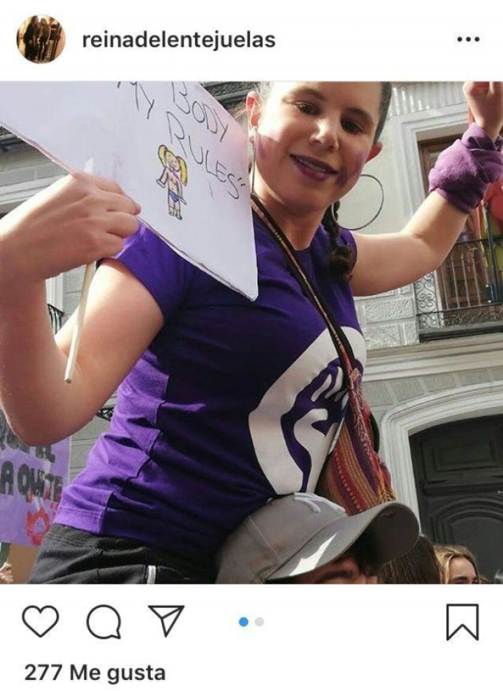La joven escribió además un emotivo mensaje dirigido a las mujeres de su familia, especialmente a su madre y su abuela. "Mi abuela luchó, mi madre luchó y aquí estoy ahora luchando yo", escribió junto a las imágenes en las que se la ve con la cara pintada de morado, una camiseta del mismo color con el símbolo feminista y una pancarta en la que se lee "my body, my rules" [mi cuerpo, mis normas].