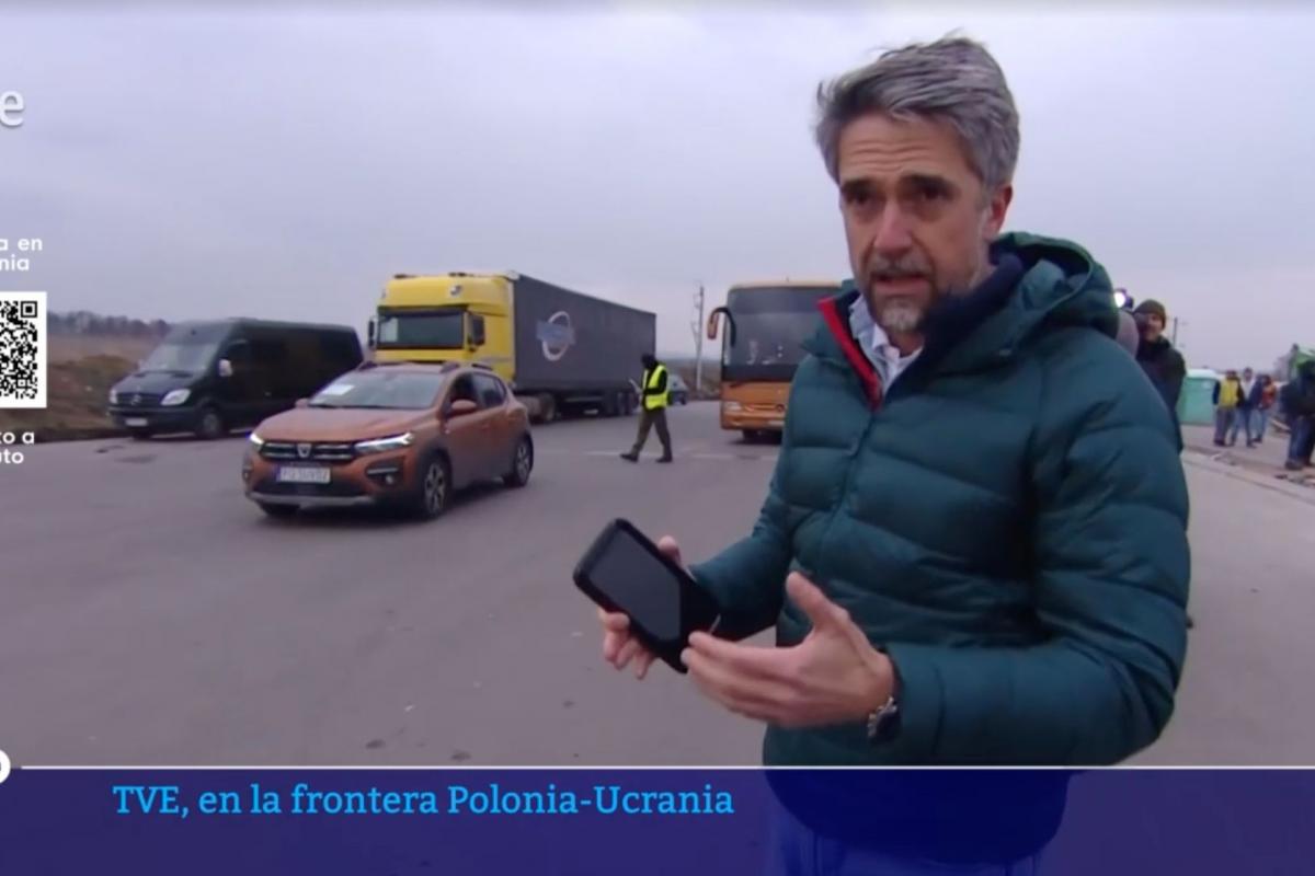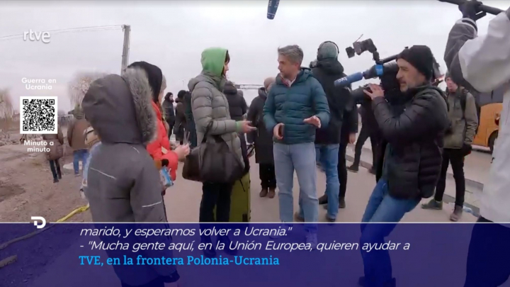 Carlos Franganillo, entrevistando a una madre de familia en la frontera entre Ucrania y Polonia.RTVE