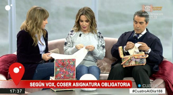 La periodista ha comenzado el programa junto a dos colaboradores, mujer y hombre, “con la labor”. En otras palabras, cosiendo, sentados en un sofa y armados con costureros. “Aquí empoderándome, que esto empodera que da gloria”, ha señalado con ironía.