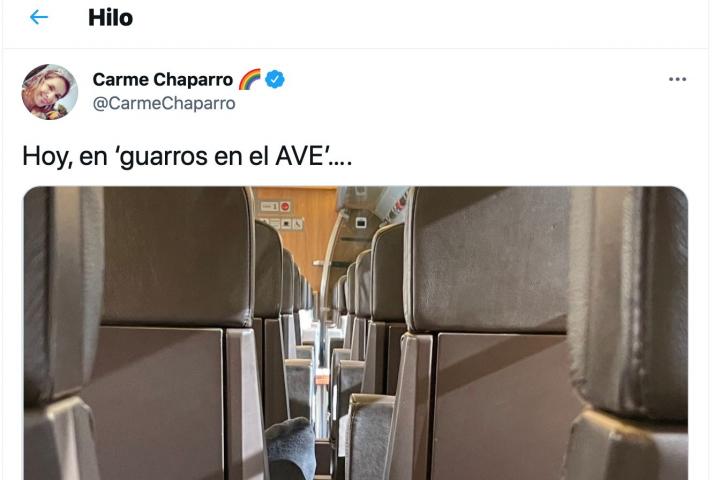 La periodista Carme Chaparro, actual presentadora junto con Marta Flich de Todo es mentira, el programa vespertino de Cuatro, ha compartido en sus redes varias publicaciones sobre lo que se ha encontrado mientras viajaba en AVE.