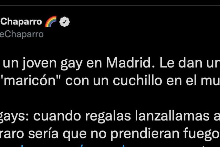 “El resultado directo de no poner freno a los discursos de odio es lo contrario a la libertad. Es que este domingo un joven reciba una paliza a las puertas de su casa, por ocho homófobos ultras, que le han cortado el labio y le han acuchillado en el muslo la palabra maricón mientras le gritan maricón asqueroso comemierda. A plena luz del día, en el centro de la -eso dicen- capital de la libertad”, continúa.