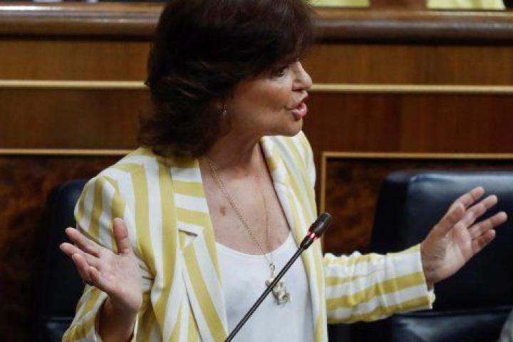 La vicepresidenta del Gobierno, Carmen Calvo, ha defendido este miércoles en el Congreso la decisión del Ejecutivo de acoger a los 630 inmigrantes y refugiados del buque 'Aquarius' y ha negado cualquier "sobreactuación" y "gestos de más" en este asunto después de que así se lo hayan reprochado desde el grupo popular.