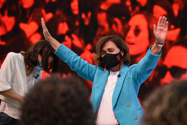 La ovación ha llegado cuando la moderadora del encuentro, la portavoz de Igualdad del PSOE en el Congreso, Laura Berja, ha presentado a Carmen Calvo.
