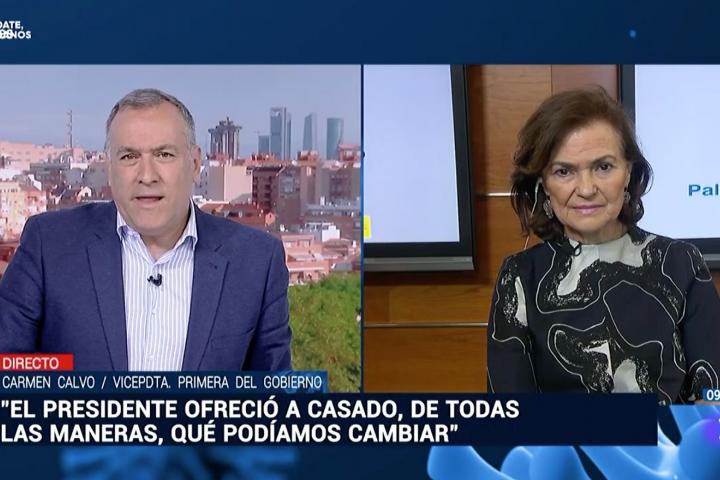 La vicepresidenta primera Carmen Calvo ha concedido este jueves su primera entrevista tras superar el coronavirus. Lo ha hecho a Los desayunos de TVE, donde preguntada por si la prórroga del estado de alarma aprobada este miércoles en el Congreso será la última, ha respondido: “Seguramente necesitaremos algunas semanas más”.