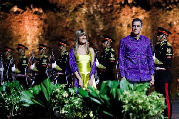 El presidente del Gobierno estuvo acompañado por su mujer, Begoña Gómez, y ambos cumplieron con el protocolo establecido para el evento, en el que debía llevar una camisa tradicional del país anfitrión, llamada batik.