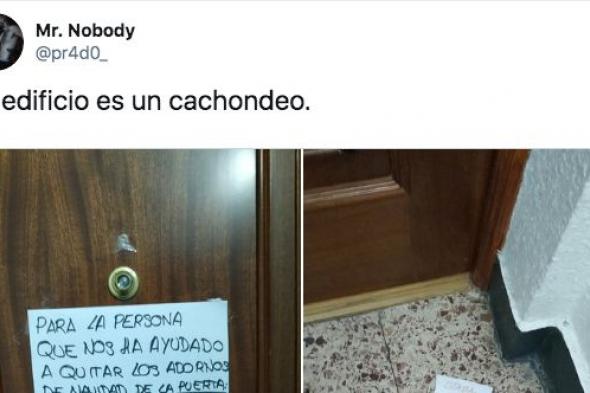 El misterio comienza con la nota pasivo-agresiva que encontró en su edificio el tuitero @pr4d0_: “Para la persona que nos ha ayudado a quitar los adornos de Navidad de la puerta. Gracias!! PD: Para el próximo año no nos los robes”.