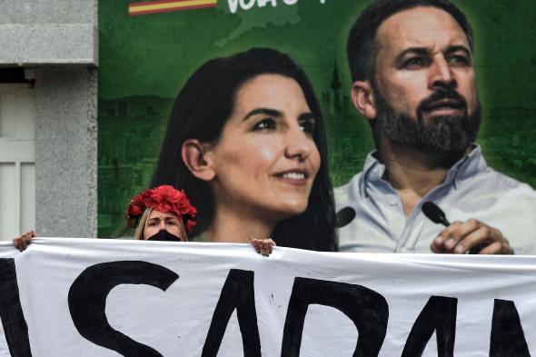 En efecto, el rostro que aparece tras la cara rajada de Abascal es el de la candidata del PP, Isabel Díaz Ayuso.