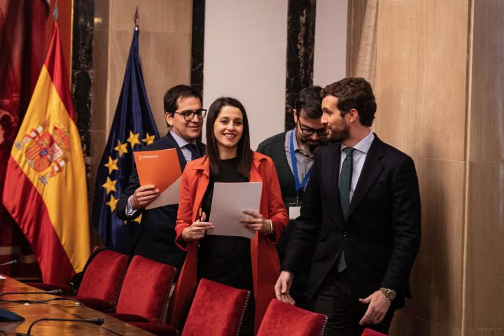 Por parte del PP, acuden a la reunión Casado con su ‘número dos’, Teodoro García Egea, mientras que los representantes de Cs son Arrimadas y José María Espejo.