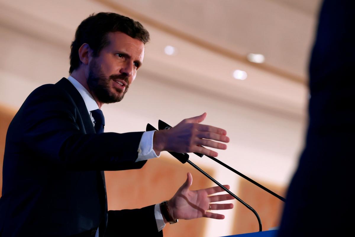 El líder conservador hablaba, además, justo ante las personas aludidas en la pregunta, ya que tanto Ayuso como Almeida lo escuchaban en una de las mesas de invitados, acompañados por el secretario general del PP, Teodoro García Egea. Ambos han estado siguiendo muy atentos las palabras de su presidente, en silencio, y no se les ha visto hacer gesto alguno cuando la pregunta les tocó de lleno.