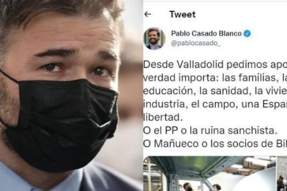El diputado de ERC Gabriel Rufián ha respondido rápidamente a un tuit del líder del PP, Pablo Casado, en el que aseguraba que este domingo en Castilla y León se decide ente su partido o los socios de Bildu y ERC.