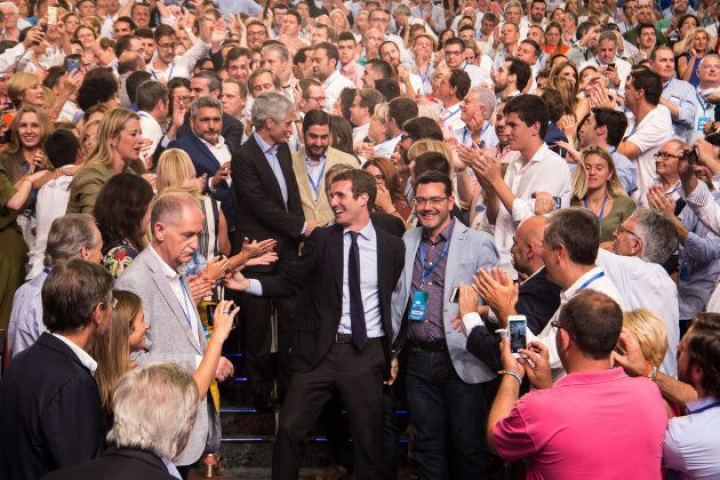 Y es que el PP le ha pedido hoy eso: más bandera, más himno. "Viva el rey", ha gritado el nuevo líder al tomar la palabra tras la victoria. Y también le han respondido con gritos de "viva España". No han faltado las consignas de "unidad, unidad, unidad", como pasó en el último congreso de Podemos en Vistalegre. Si es que al final los partidos se parecen más de lo que creen.
