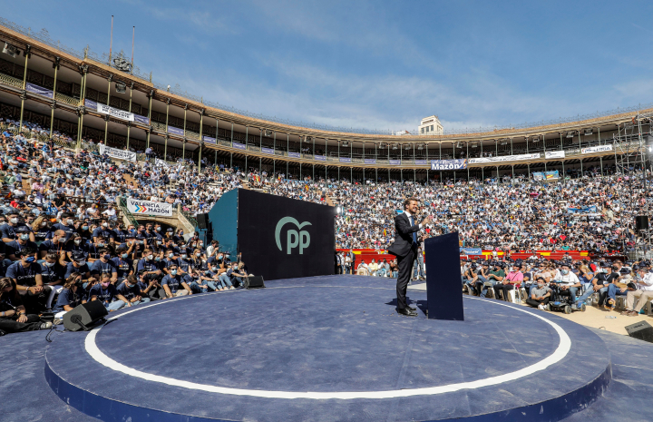 El gran momento de Casado llegaba el domingo al mediodía. Pasado el trago de Ayuso, tocaba el turno de volver a la plaza de toros de Valencia seis años después. El gran símbolo para el PP, el talismán de Aznar y Rajoy antes de ganar las elecciones, el lugar en el que a los populares les gusta el exhibicionismo.