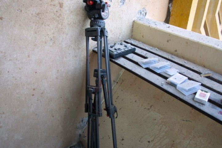 Cintas, baterías, cigarros y un trípode, en uno de los balcones atacados del Palestina.Getty Images