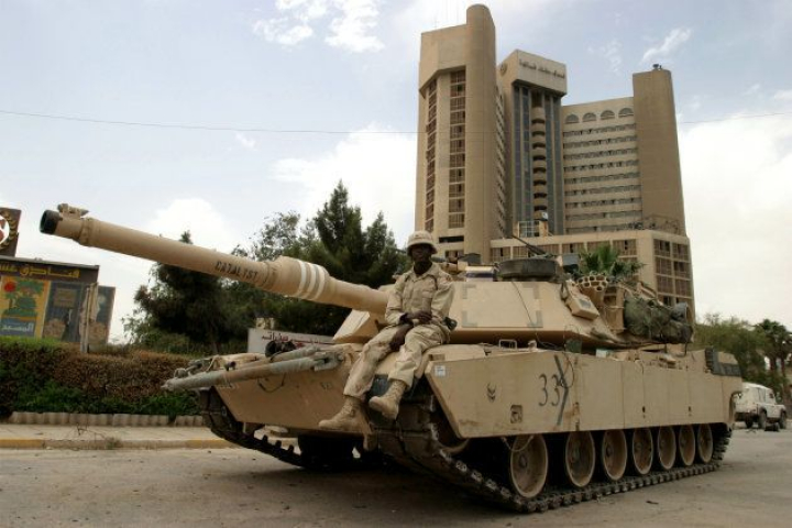 Un tanque M1 Abrams, del Ejército de EEUU, ante el Hotel Palestina, un mes después de la muerte de Couso y Protsyuk.Reuters Photographer / Reuters