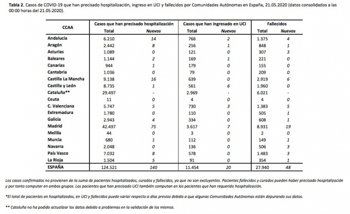 Con respecto a las UCI, han sido trasladados 20 de los diagnosticados, siete en Madrid y seis en Castilla y León. La cantidad absoluta de personas que han pasado por las unidades de cuidados intensivos se eleva hasta las 11.454. Todo ello, a falta de la última actualización de Cataluña.