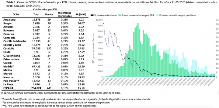 El número de nuevos positivos detectados por PCR sube ligeramente este viernes en 446, frente a los 344 de este jueves. Soria es la provincia donde el índice casos por 100.000 habitantes ha sido más alto (23) en los últimos siete días. En total, en España son 234.824 los contagios detectados con la técnica de PCR.