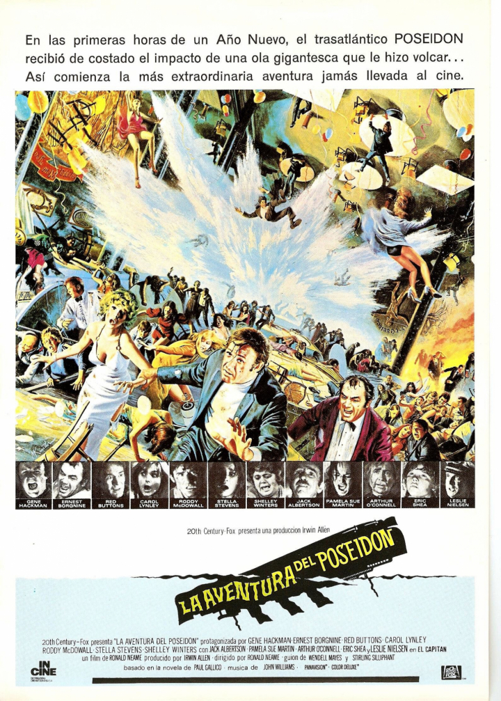 La producción de Irwin Allen, La aventura del Poseidón, dirigida por Ronald Neame, es el paradigma de la película de catástrofes. Fue de las primeras de aquella moda de los setenta, tras Aeropuerto, y de las más exitosas y recordadas, junto a El coloso en llamas, donde grupos de todas las edades, con mascotas incluidas, se enfrentaban al cataclismo que se sumaba a sus problemas personales. En la película de Neame, un lujoso trasatlántico en el Mediterráneo, tras pasar por el estrecho camino de Grecia, vuelca en plena Nochevieja, gracias a una ola gigante, y a un fallo en la nave debido a la avaricia del constructor. A partir de ahí, los viajeros vestidos con sus mejores galas, se enfrentan a un conjunto de toma de decisiones que les lleva a la salvación colectiva o a la destrucción personal, en un mundo al revés, ya que el barco queda boca abajo. Como la vida misma.