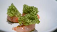 El menú empieza con dos sopas andaluzas. Primero un gazpacho picante acompañado de quisquilla y concha fina, tras esto un ajoblanco con tomate asado. Maravilloso ambos pases, finos, con diferentes contrastes y que permiten lucir tanto a la materia prima como a la sopa.