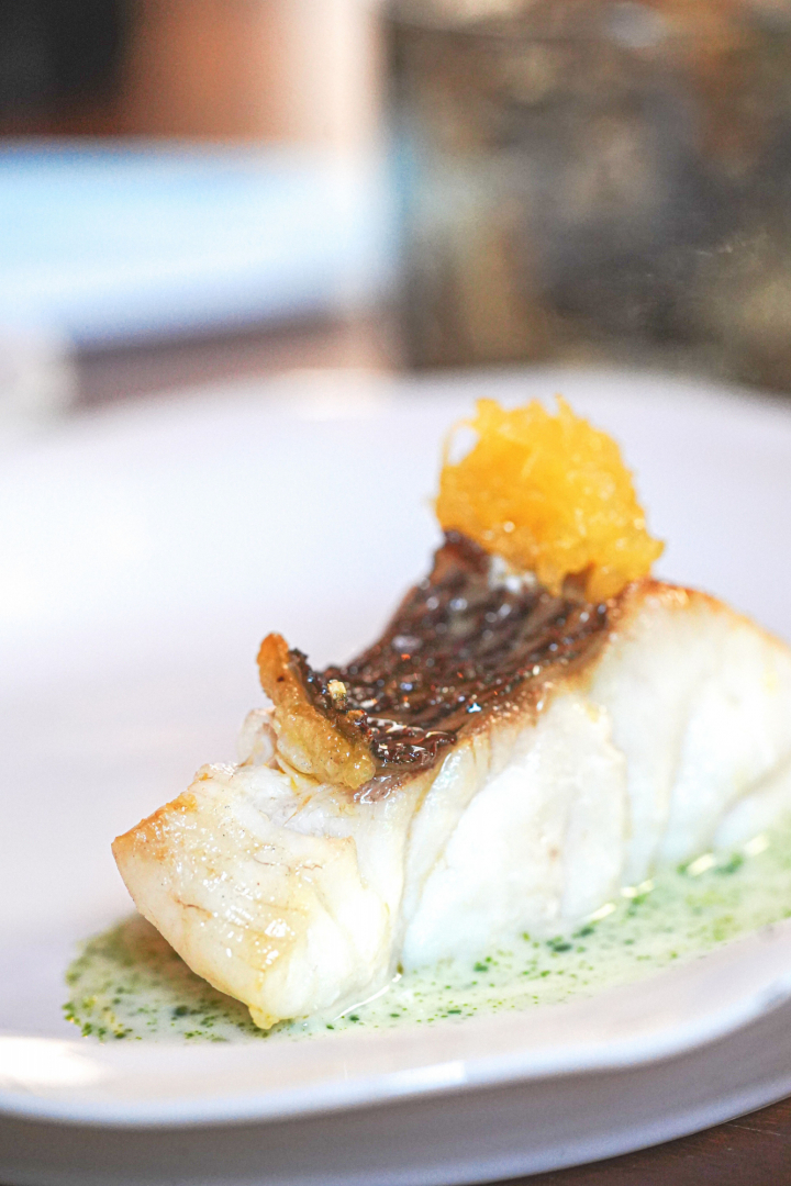 Sigue con dos productos tan complicados de casar como la ortiguilla y la ostra. La primera de ellas frita, con una salsa benedictine que acompaña dando melosidad. La ostra, a la brasa, se combina con otra salsa tradicional francesa como la bearnesa. Es de apreciar la espectacular mano que hay en esta casa con las salsas.