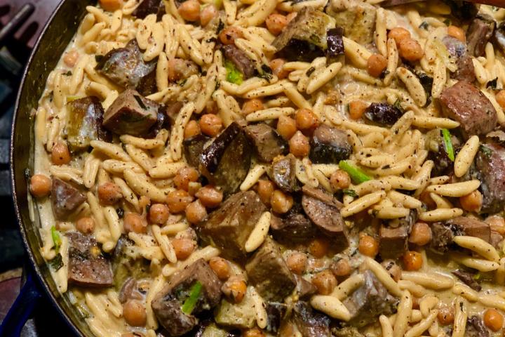 Cavatelli con garbanzos, berenjenas y hongos frescos