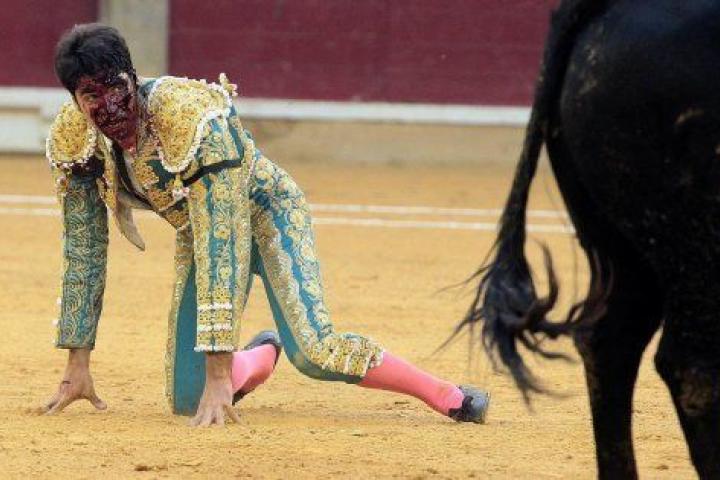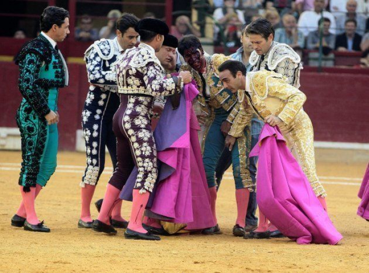 La imagen del torero es muy llamativa, ya que dio con la cara en el lomo ensangrentado del animal. El diestro ha sufrido una cornada de tres trayectorias en la cara interna del tercio superior del muslo izquierdo, pero no afecta a vasos principales.