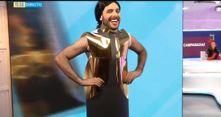 Los presentadores del espacio de Divinity, Nando Escribano y Nuria Marín, empezaron a repasar los looks elegidos por Anne Igartiburu o Paz Padilla, hasta que decidieron valorar el de Pedroche. Germán González, reportero del programa, parodió a la vallecana colocándose un traje como el que lució en las campanadas.