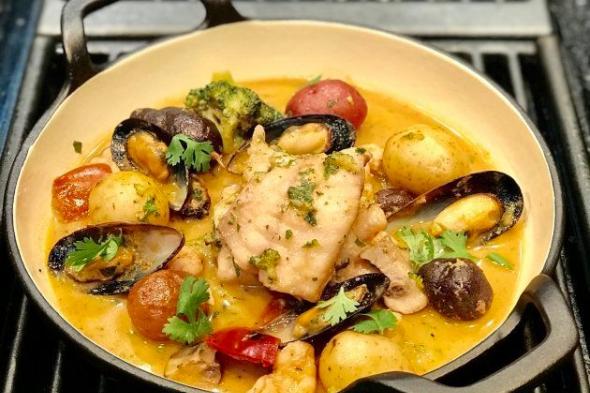 En una olla rectangular de hierro fundida, depositar el salteado de setas... Colocar el pescado sazonado por ambos lados con la parte de la piel hacia abajo. Cubrir con el caldo de langostinos, disponer los mejillones, las patatas y las almejas en forma armoniosa, tapar con papel aluminio e introducir al horno a 200º durante 10/12 minutos.