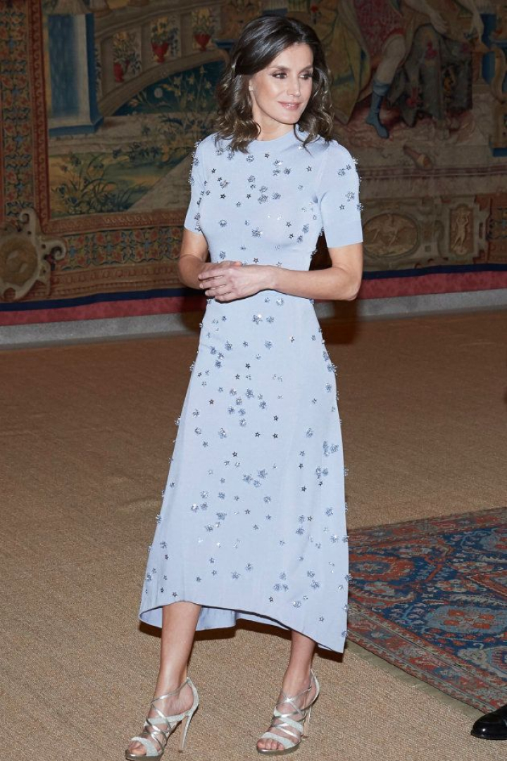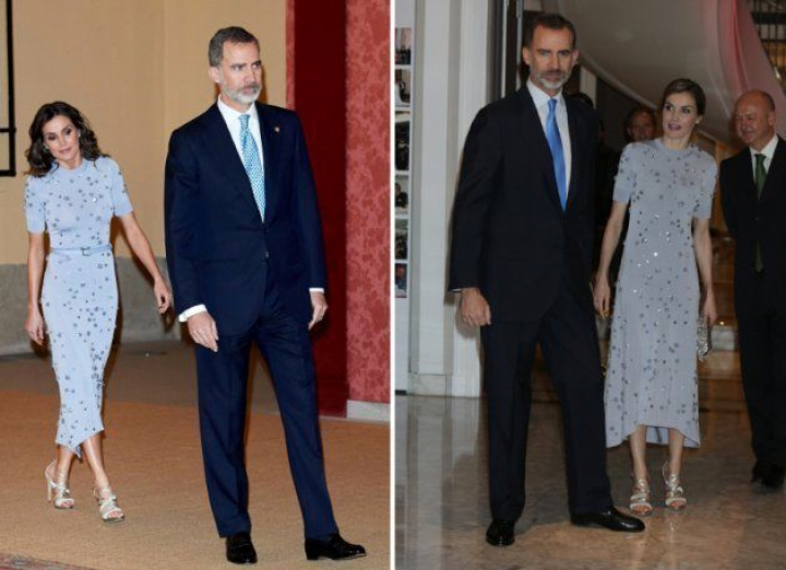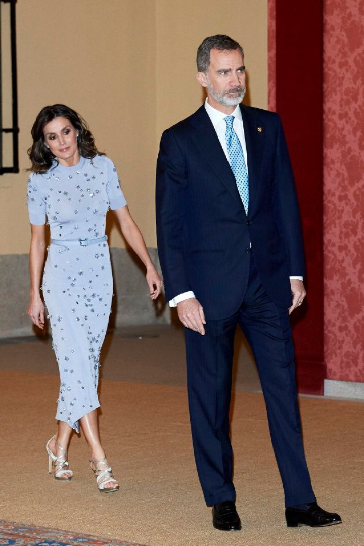 La mujer del rey Felipe VI rescató un diseño gris perla de Nina Ricci, que ya había lucido en el 60º aniversario de la agencia Europa Press en 2017 aunque entonces había quedado eclipsado por la coleta burbuja con la que apareció en el acto.