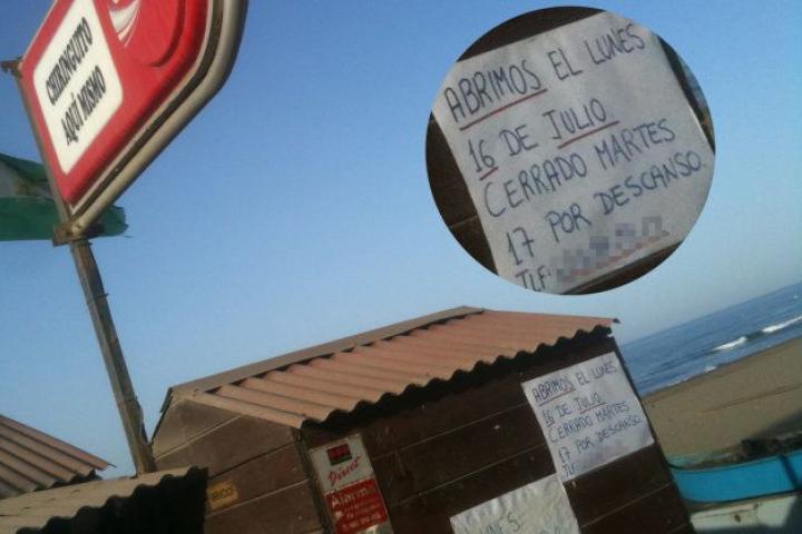 Extraña en la Costa del Sol, porque cualquier visitante que llega a este paseo marítimo en los primeros días de julio se encuentra con que aún no ha empezado la temporada. Aunque lo que más llama la atención es el cartel celtibéricamente grapado con el celtibérico aviso: "Primer día de la temporada el lunes, y ya el martes, agotados, descansamos".