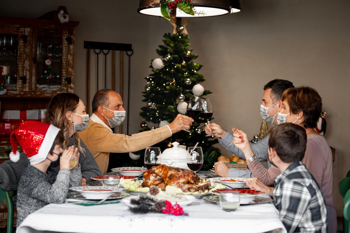 Two family members in surgical masks toast at the Christmas Thanksgiving table at home in the year of the Coronavirus. Happy family members wear surgical masks to comply with new health regulations.Basilico Studio Stock via Getty Images