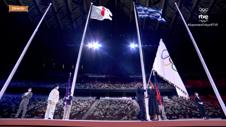 Momento del relevo. En presencia de la alcaldesa de París, Anne Hidalgo, suena el himno olímpico y se producirá el traspaso de Tokio a la capital francesa, que albergará los Juegos en 2024.
