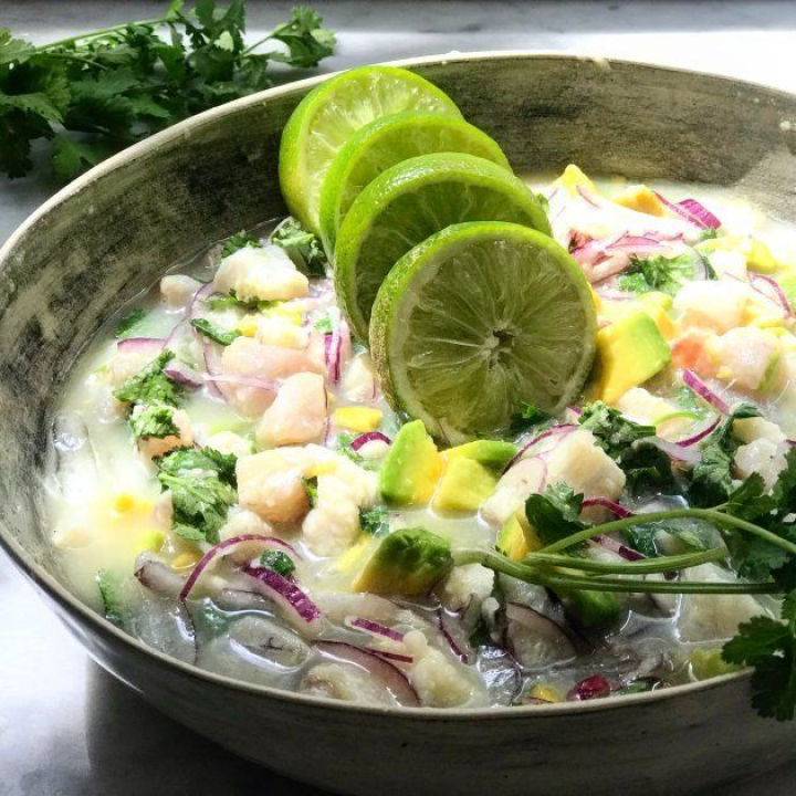 Sacar el pescado de la marinada, escurrir ligeramente y colocarlo en una fuente ancha, salpimentar. Añadir el aguacate en dados, remover con cuidado para no romper ni deshacer el la corvina ni el aguacate. Colocar cebolla roja en juliana por encima (cortes muy finos), la otra mitad de cilantro y el resto de hielo.