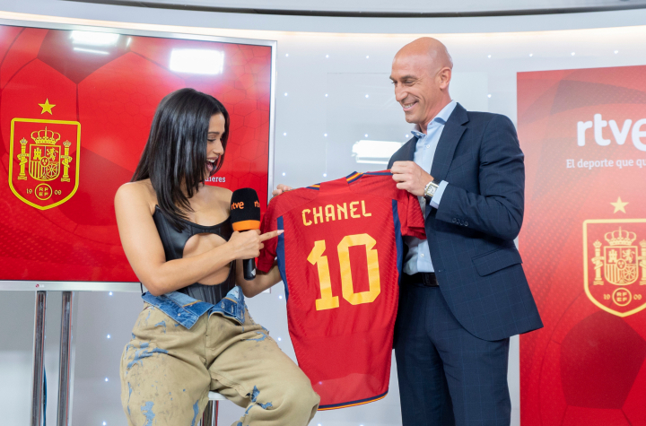 Con un lookazo muy atrevido, protagonizado por un corpiño negro sin tirantes que dejaban ver la parte inferior de sus pechos, Chanel ha recibido como regalo de parte del presidente de la RFEF, Lui Rubiales, una camiseta de la selección con su nombre. “Si la canción TOKE nos trae suerte sacaremos a hombros a Chanel. Nos va a poner a todos las pilas para estar a tope con la Selección”, ha afirmado Rubiales durante la presentación. “La Selección es muy parecido a lo que hace Chanel. ¡Vamos a hacer un buen equipo!”, añadía.