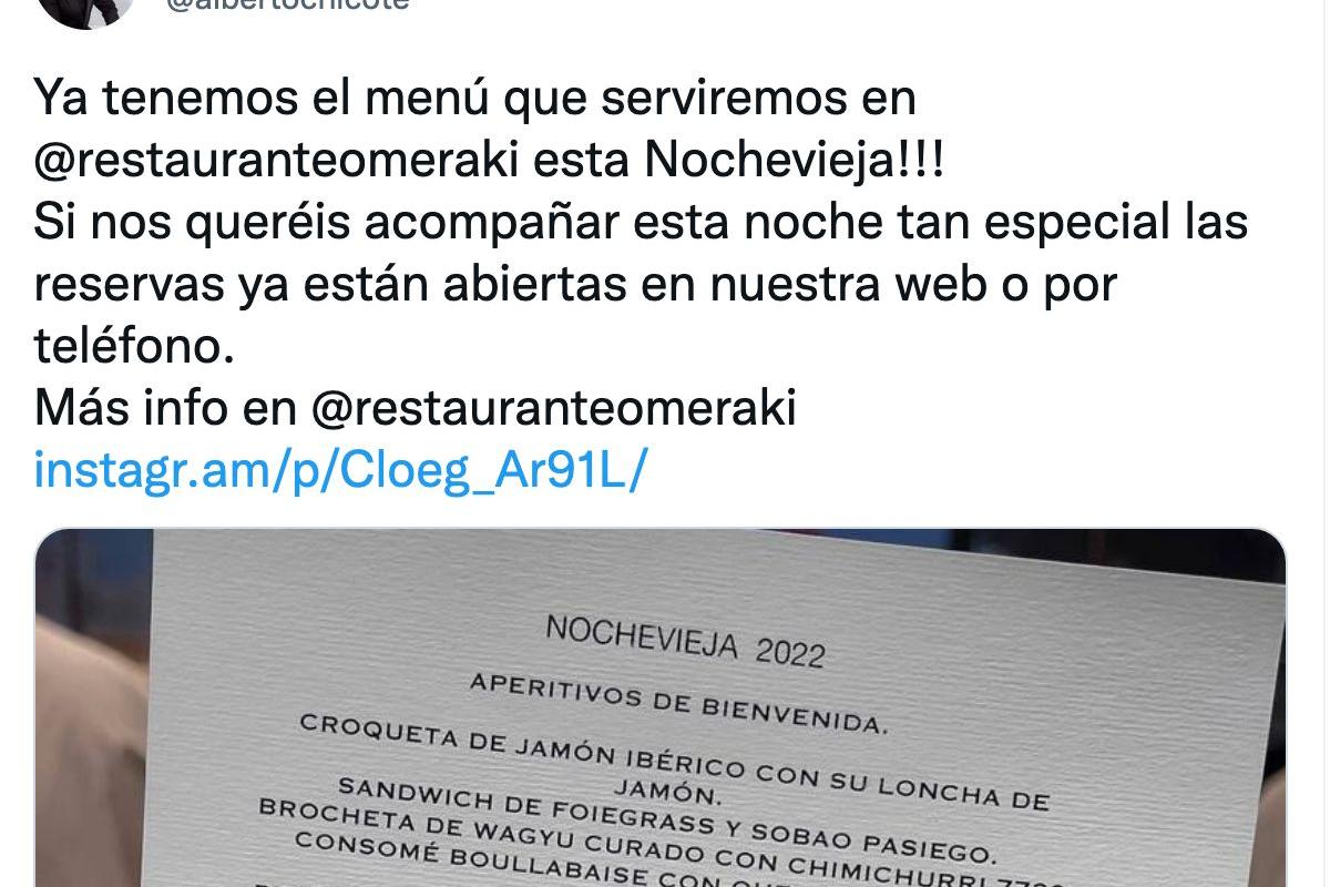 “Ya tenemos el menú que serviremos en @restauranteomeraki esta Nochevieja!!! Si nos queréis acompañar esta noche tan especial las reservas ya están abiertas en nuestra web o por teléfono”, ha escrito el cocinero en su perfil de Twitter, donde tiene más de 560.000 seguidores.