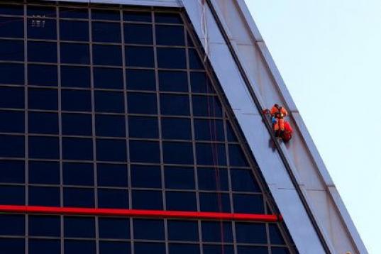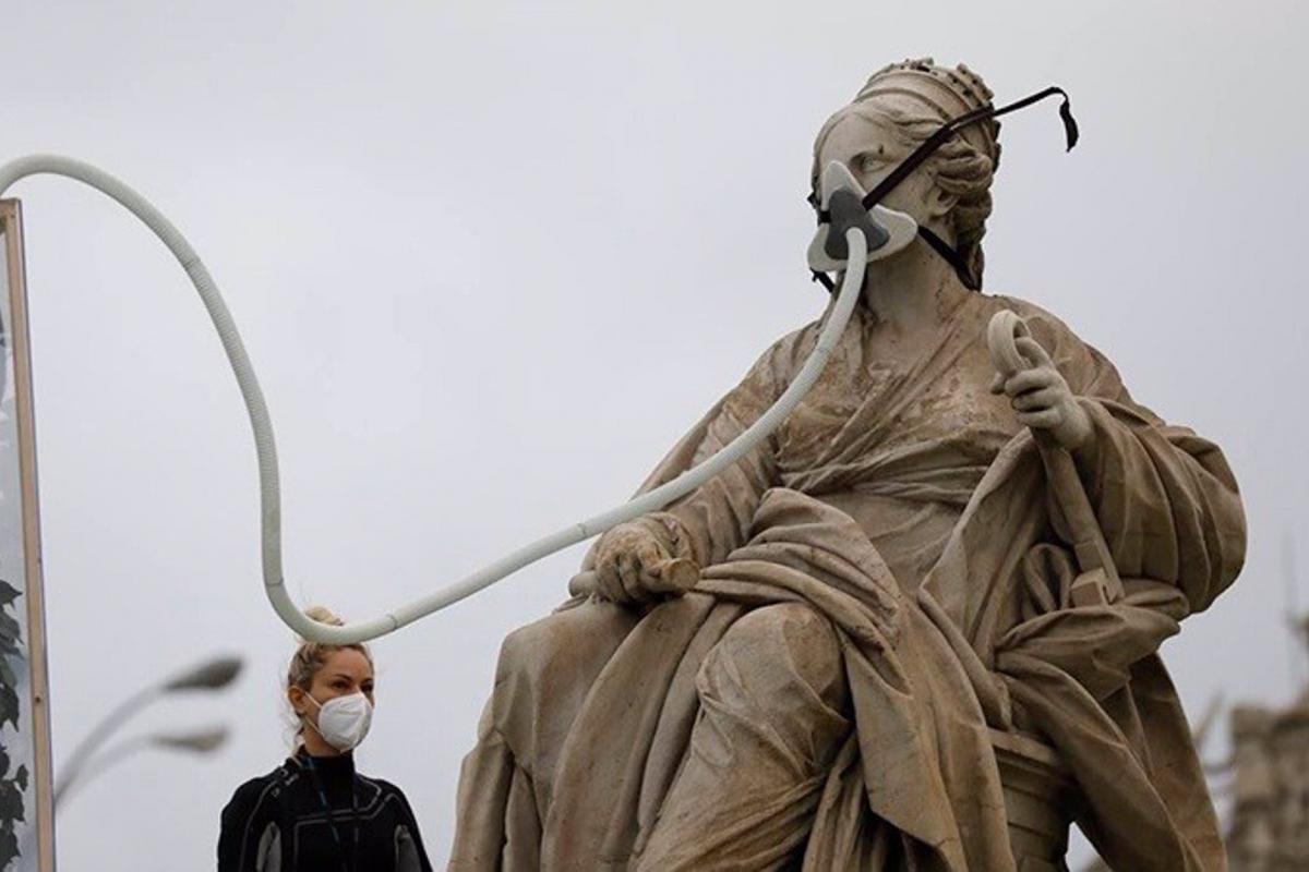 Durante la acción, han accedido pacíficamente al perímetro de la fuente para cubrir la nariz y la boca de la escultura con una mascarilla antipolución. Al mismo tiempo, otro equipo de escalada ha ascendido a dos farolas próximas para desplegar una pancarta de más de 50 metros cuadrados con el lema ‘Ciudades Verdes, planeta sano’.