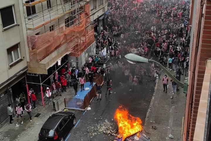 Sin embargo, cientos de aficionados del Athletic de Bilbao han preferido salir a la calle en una vergonzosa aglomeración pública saltándose todo tipo de precaución sanitaria y llegando a cruzar contenedores y prender fuego a algunos de ellos.