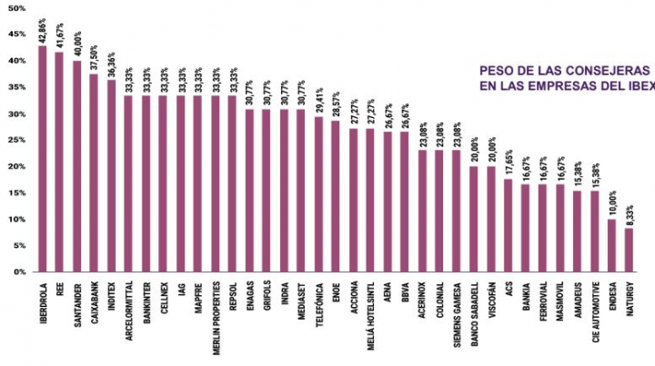 Solo hay tres empresas del Ibex 35 que alcanzan el 40% de presencia femenina en sus consejos: Iberdrola, Red Eléctrica y Santander. En el lado contrario se sitúa Naturgy —antigua Gas Natural— que solo tiene el 8%.