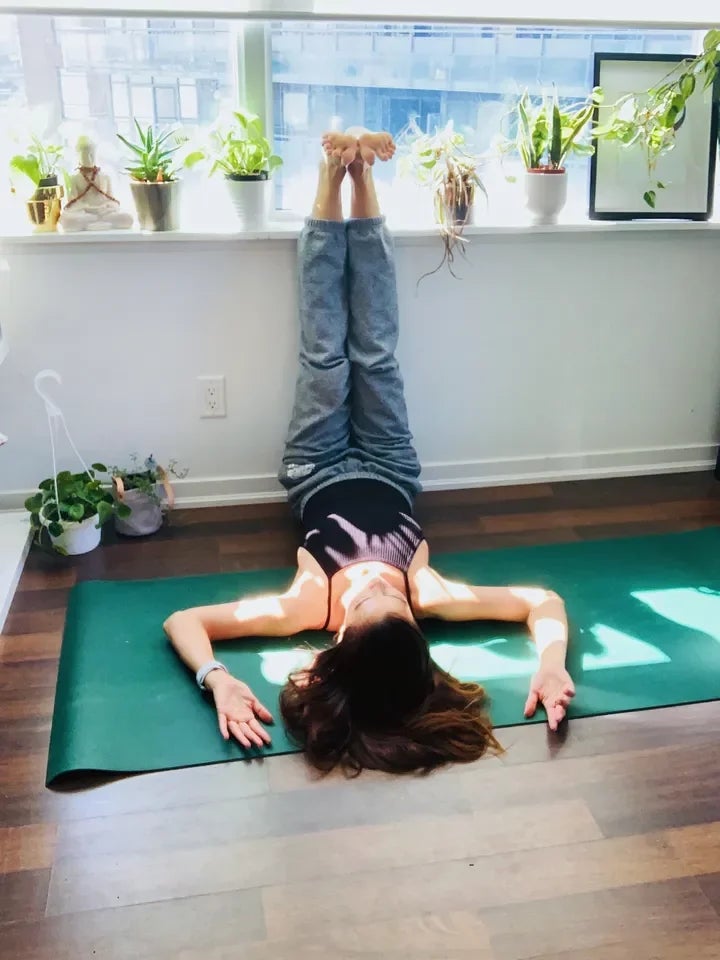 Cómo se hace: Túmbate de espaldas con las nalgas pegadas a la pared, con las piernas totalmente extendidas hacia arriba y con los pies en un ángulo de 90 grados hacia ti (o apuntando hacia arriba, lo que más cómodo te resulte). Separa los brazos del cuerpo.