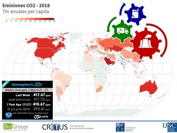 - Los pescados y las carnes presentan variaciones notables en función de la especie. A modo de ejemplo, la sardina se sitúa en 360 g CO₂(eq)/kg, el bacalao en 1 500 g CO₂(eq)/kg, el pollo en 3 000 g CO₂(eq)/kg y la ternera en 9 000 g CO₂(eq)/kg.