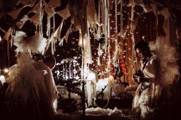 El título de este artículo cuenta lo que sucede en esta obra y, aunque parezca mentira, no la destripa porque Circo de sastre en el Centro Internacional de Artes Vivas de las Naves del Matadero es, antes que nada, una experiencia. Donde la música, la iluminación – a penas sencillos juegos de luz en la penumbra – y la sastrería se juntan para que el espectador, libremente, asocie y construya su propia obra. Ya sea un conjunto de sensaciones o una historia.