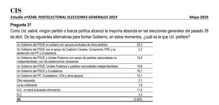En concreto, el Centro de Investigaciones Sociológicas pregunta: ″Como Ud. sabrá, ningún partido o fuerza política alcanzó la mayoría absoluta en las elecciones generales del pasado 28 de abril. De las siguientes alternativas para formar Gobierno, en estos momentos, ¿cuál es la que Ud. prefiere?″