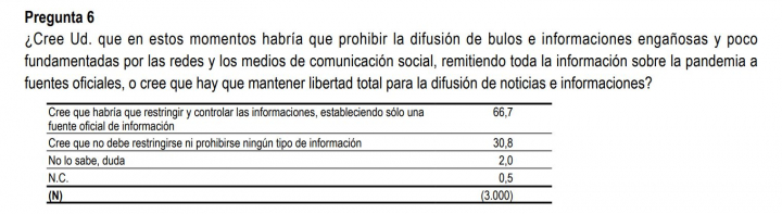 Un 66,7 % de los preguntados sí cree que “habría que restringir y controlar las informaciones, estableciendo sólo una fuente oficial de información”, un dato que contrasta con el 30,8 % que cree que “no debe restringirse ni prohibirse ningún tipo de información”.