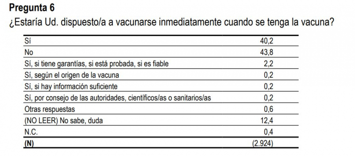 Otro resultado llama la atención: hasta un 12,4% de los encuestados no se ha decidido acerca de si se vacunaría o no.
