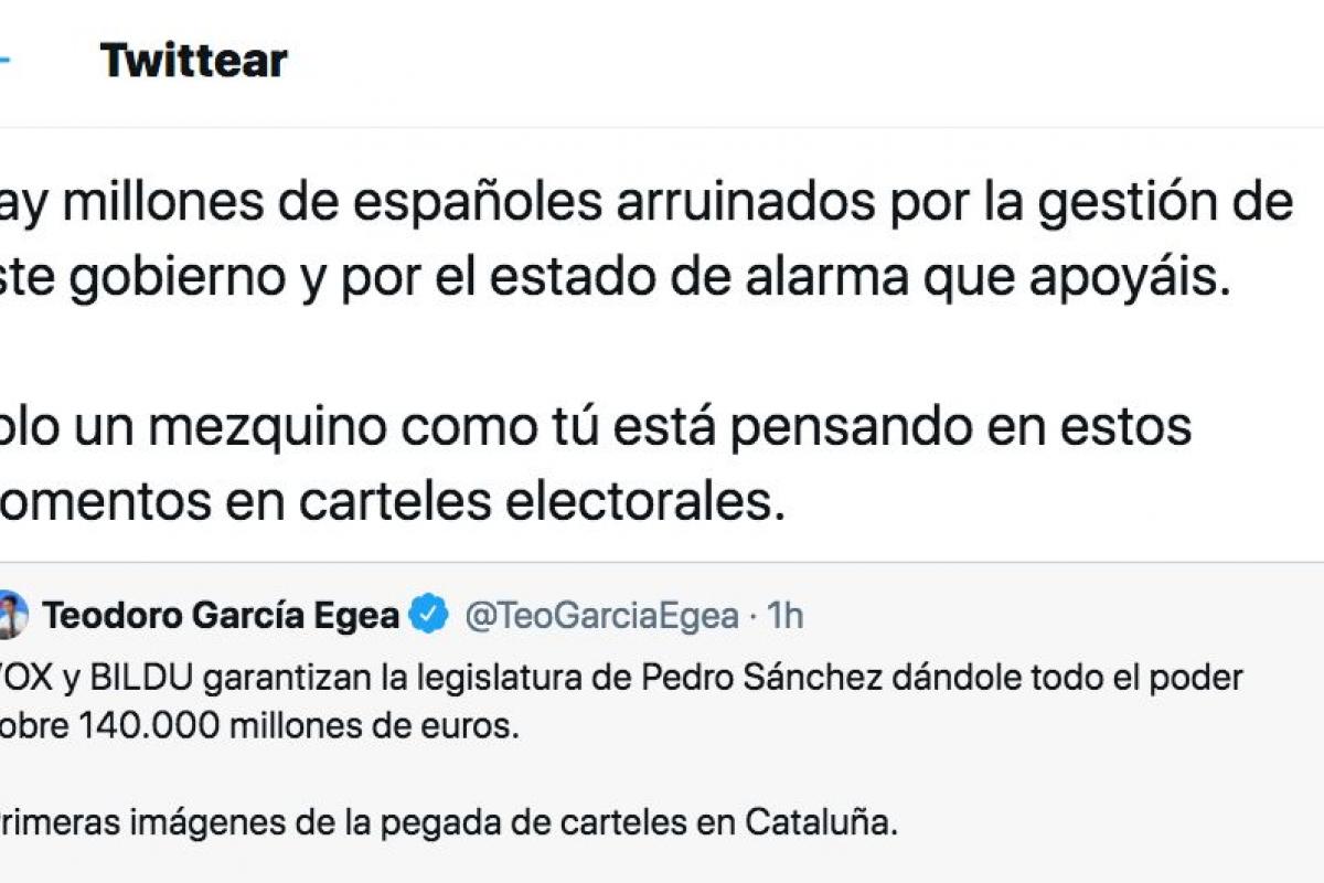 Una publicación que no ha gustado nada, por lo que sea, a Javier Ortega Smith, diputado de Vox en el Congreso y en el Ayuntamiento de Madrid. “Mientes Teodoro. Como siempre. Hay millones de españoles arruinados por la gestión de este gobierno y por el estado de alarma que apoyáis. Solo un mezquino como tú está pensando en estos momentos en carteles electorales”, le ha respondido el dirigente de Vox.